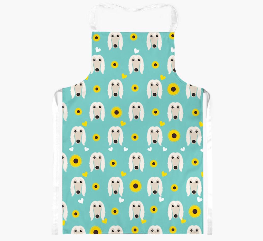 This apron has a delightful sunflower and heart pattern, and best of all - it's personalized with Afghan Hound's face too! This cute and colorful apron is sure to put a smile on every dog lover's face.