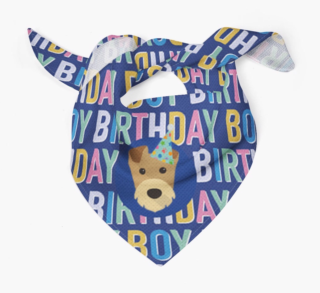 Featuring a colorful text pattern that reads 'birthay boy' and personalized with Airedale Terrier's cute icon (complete with a fun party hat), your Airedale will look simply pawgeous on their special day when they're wearing this bandana.