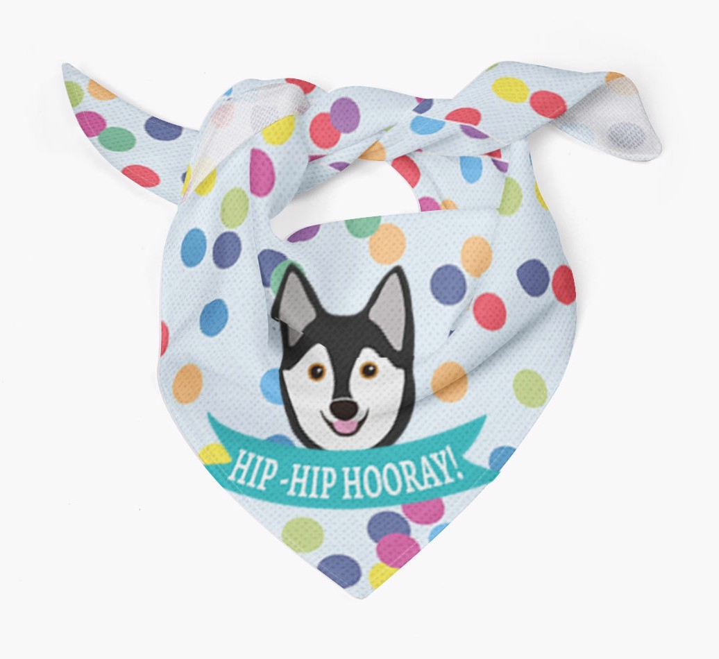 Featuring our famous Klee Kai icon and the words ‘hip-hip hooray!’ printed upon a colorful confetti background, Your Alaskan Klee Kai is sure to look pawty ready wearing this bandana.