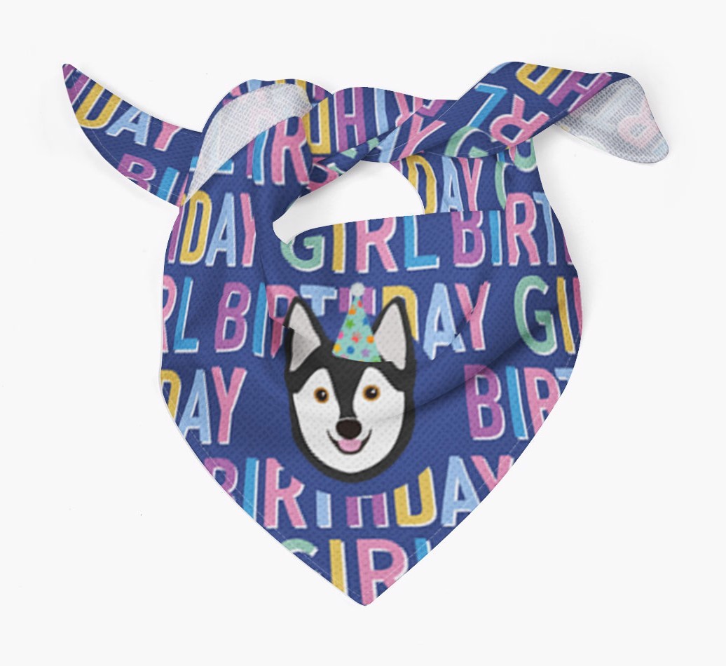 Featuring a text pattern that reads 'birthay girl' and personalized with Alaskan Klee Kai's cute icon (complete with a fun party hat), your Klee Kai will look simply pawgeous on their special day when they're wearing this bandana.