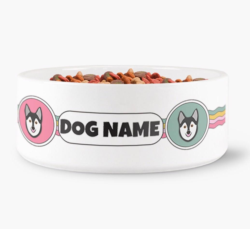 This jazzy dog bowl is sure to make waves with Alaskan Klee Kai! With a colorful wavy pattern, this bowl is personalized with adorable Klee Kai icons and Alaskan Klee Kai’s name to make it extra special.