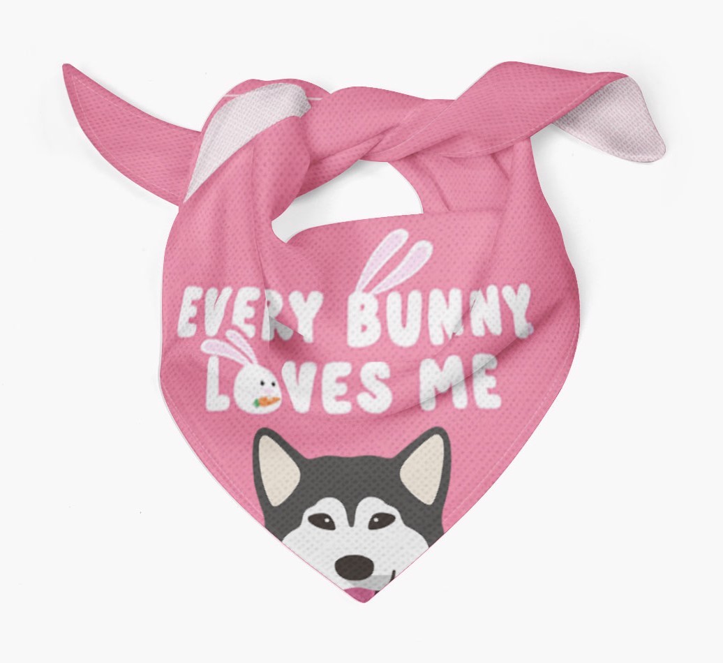 Tailored with the fabulous saying: 'Every Bunny Loves Me', this bandana is the perfect addition to your Alaskan Malamute's wardrobe! Available in four egg-ceptional colors and personalized with your Alaskan Malamute's icon, this is the perfect pawchase for Easter!