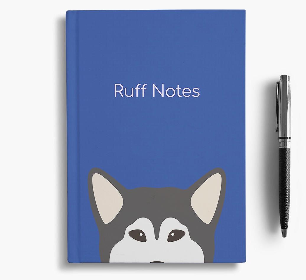 The front cover features our exclusive Malamute peeking icon and is printed with the words, ‘Ruff Notes’, whilst the back is printed with the words ‘Live. Laugh. Woof.’.