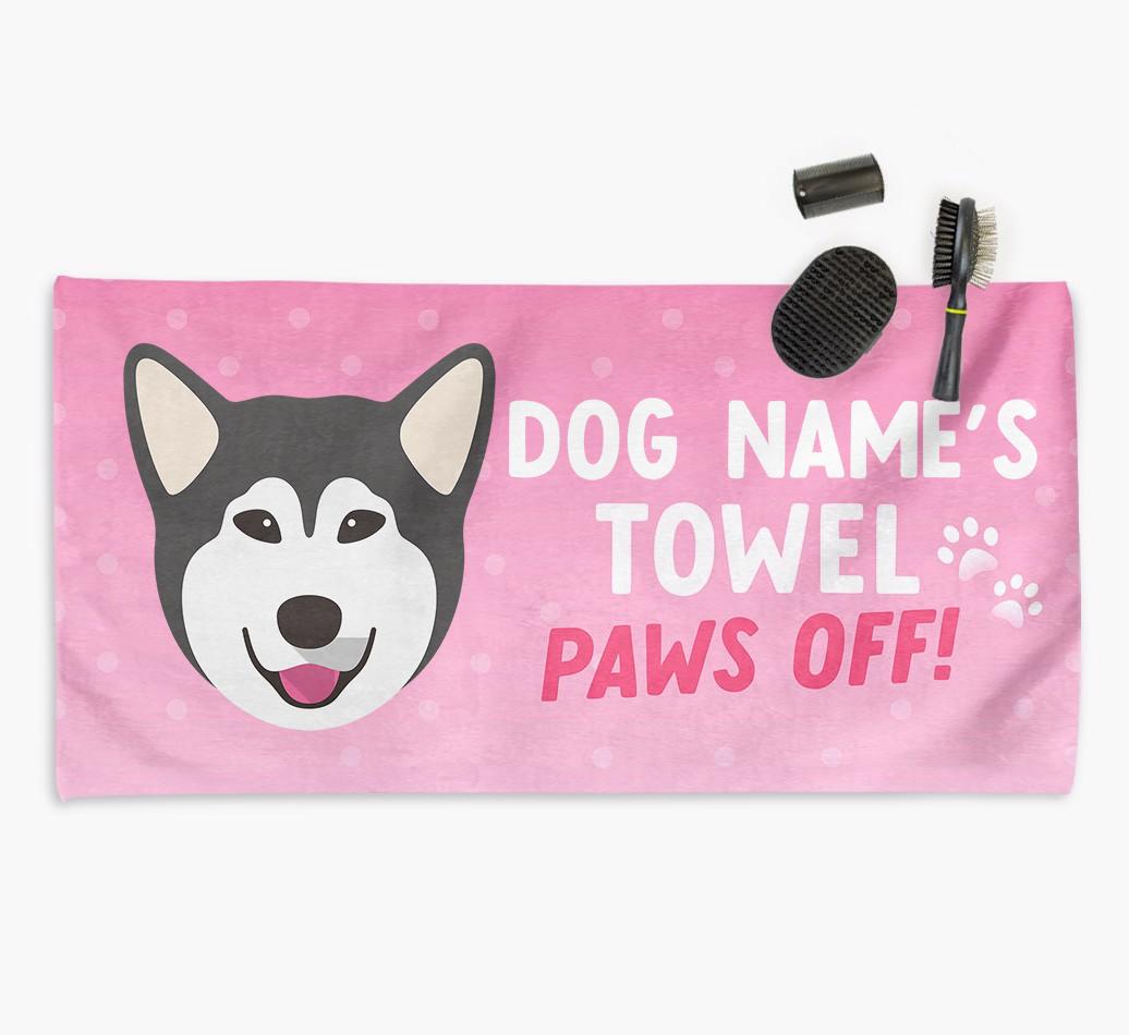 Perfect for messy pups and for pampering your Mally at bathtime, this soft and absorbent towel is made for cleaning your mucky pup and drying them off in a flash. It's personalized with Alaskan Malamute's name and icon and is printed with a message for everyone else to keep their paws off it!