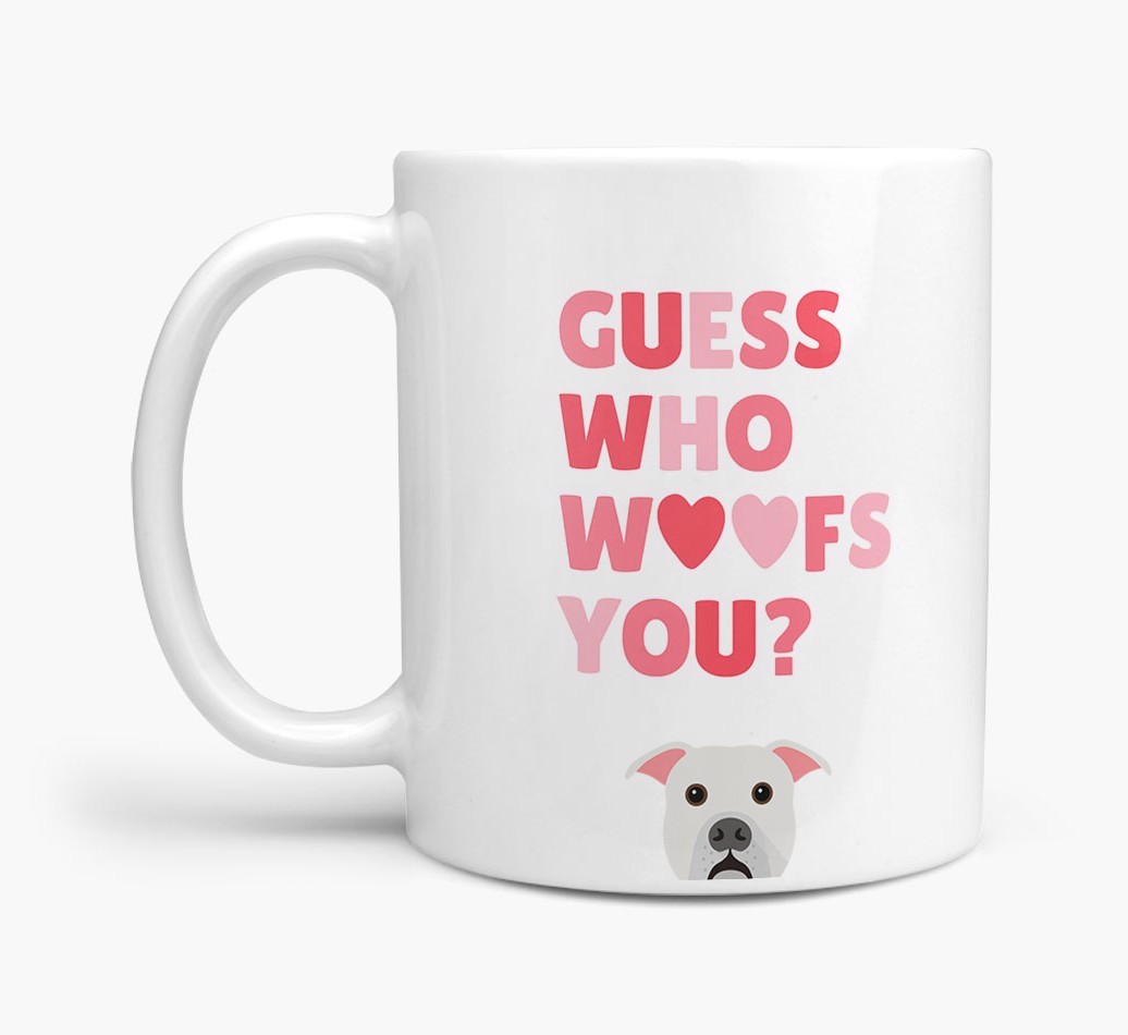 Personalized with American Bulldog's cute face, this adorable mug is perfect for showing off the one who "woofs" you - how sweet!