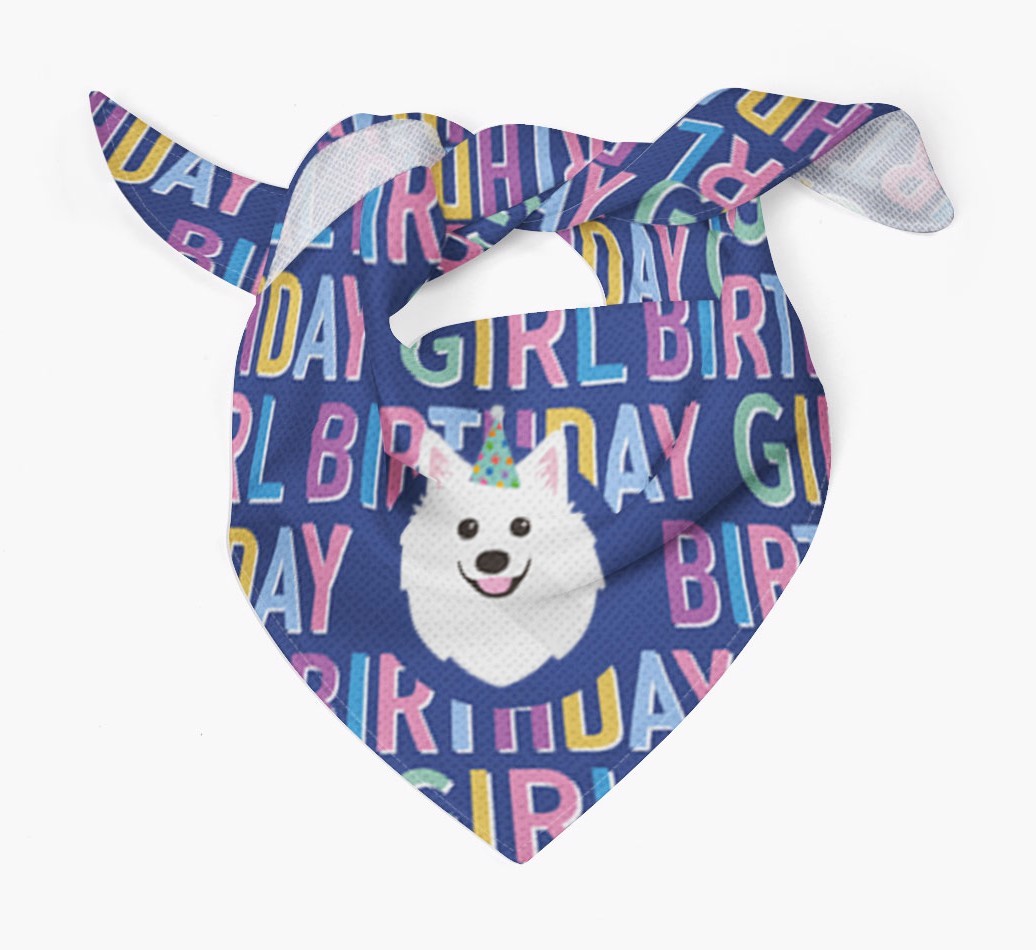 Featuring a text pattern that reads 'birthay girl' and personalized with American Eskimo Dog's cute icon (complete with a fun party hat), your Eskie will look simply pawgeous on their special day when they're wearing this bandana.