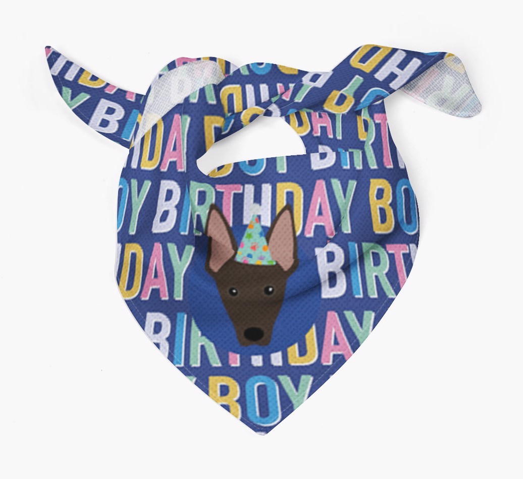 Featuring a colorful text pattern that reads 'birthay boy' and personalized with American Hairless Terrier's cute icon (complete with a fun party hat), your Hairless will look simply pawgeous on their special day when they're wearing this bandana.