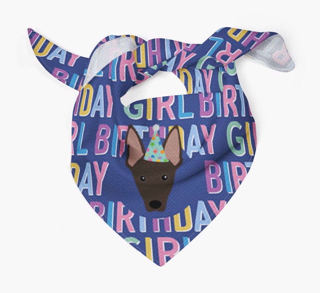 Featuring a text pattern that reads 'birthay girl' and personalized with American Hairless Terrier's cute icon (complete with a fun party hat), your Hairless will look simply pawgeous on their special day when they're wearing this bandana.