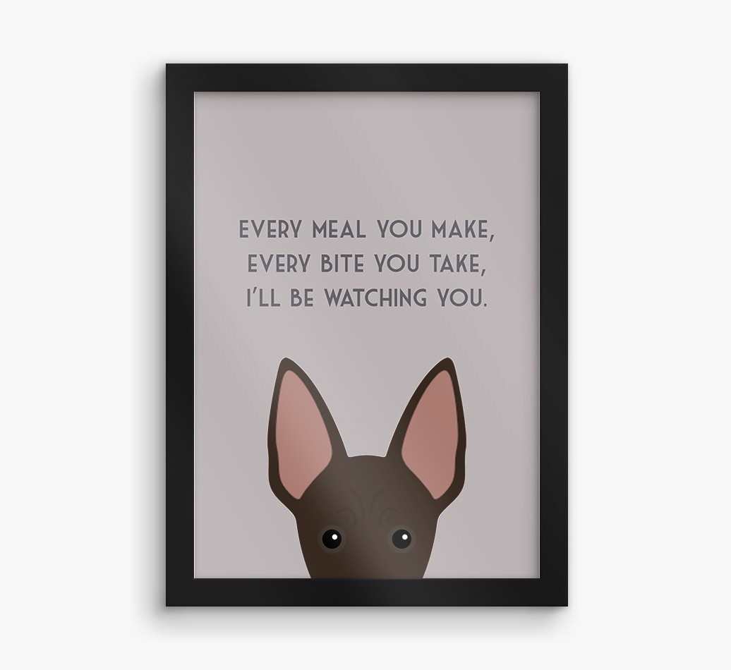 Printed with the words, ‘Every meal you make, every bite you take, I’ll be watching you’ and complete with our cute Hairless peeking from the bottom of the design, this artwork will look great on display in the kitchen or anywhere American Hairless Terrier likes to watch you eat!