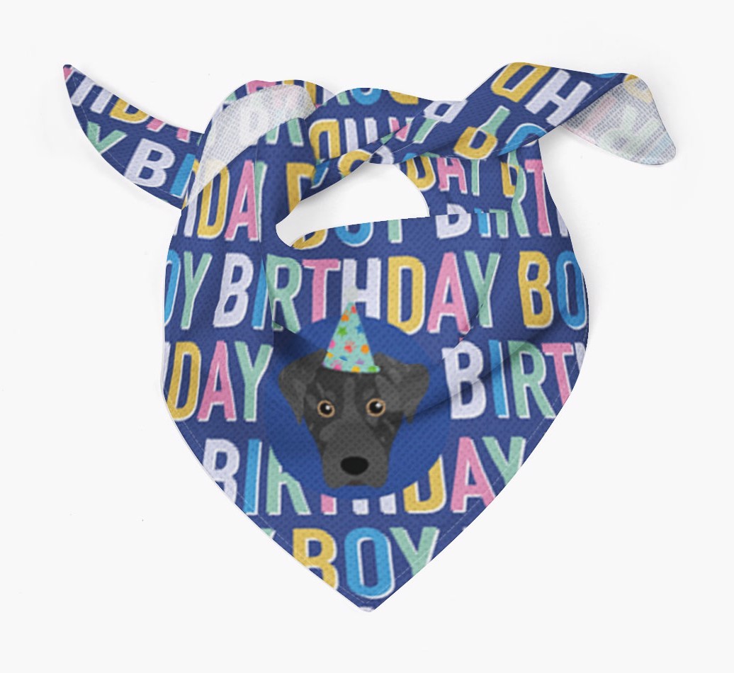 Featuring a colorful text pattern that reads 'birthay boy' and personalized with American Leopard Hound's cute icon (complete with a fun party hat), your Leopard Cur will look simply pawgeous on their special day when they're wearing this bandana.