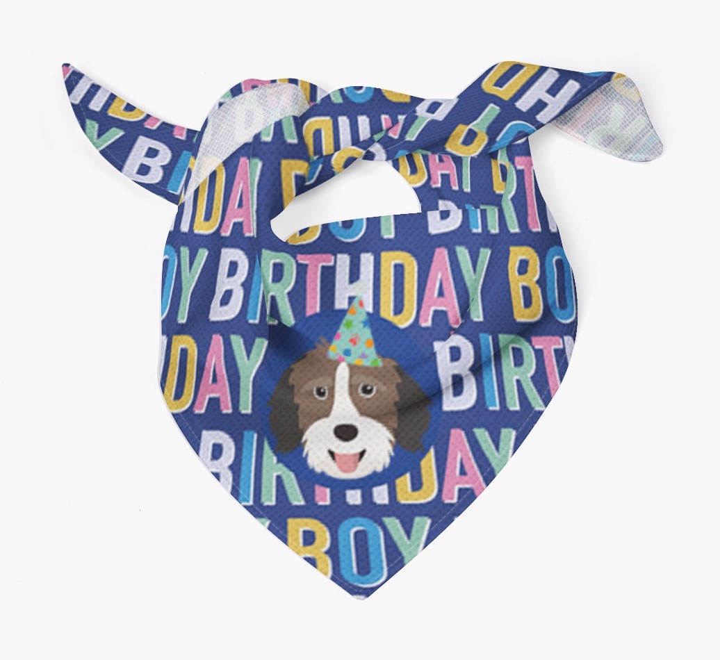 Featuring a colorful text pattern that reads 'birthay boy' and personalized with Aussiedoodle's cute icon (complete with a fun party hat), your Aussiepoo will look simply pawgeous on their special day when they're wearing this bandana.
