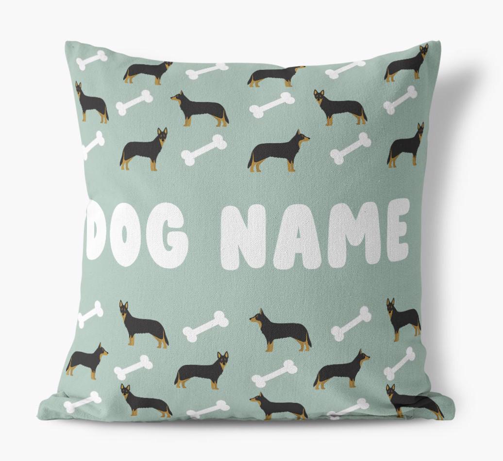 Personalized with Australian Kelpie’s name against a background of Kelpie icons and bones, this gorgeous pillow is full of pawsonality.