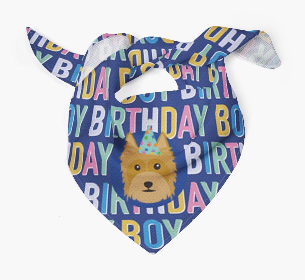 Featuring a colorful text pattern that reads 'birthay boy' and personalized with Australian Silky Terrier's cute icon (complete with a fun party hat), your Silky will look simply pawgeous on their special day when they're wearing this bandana.