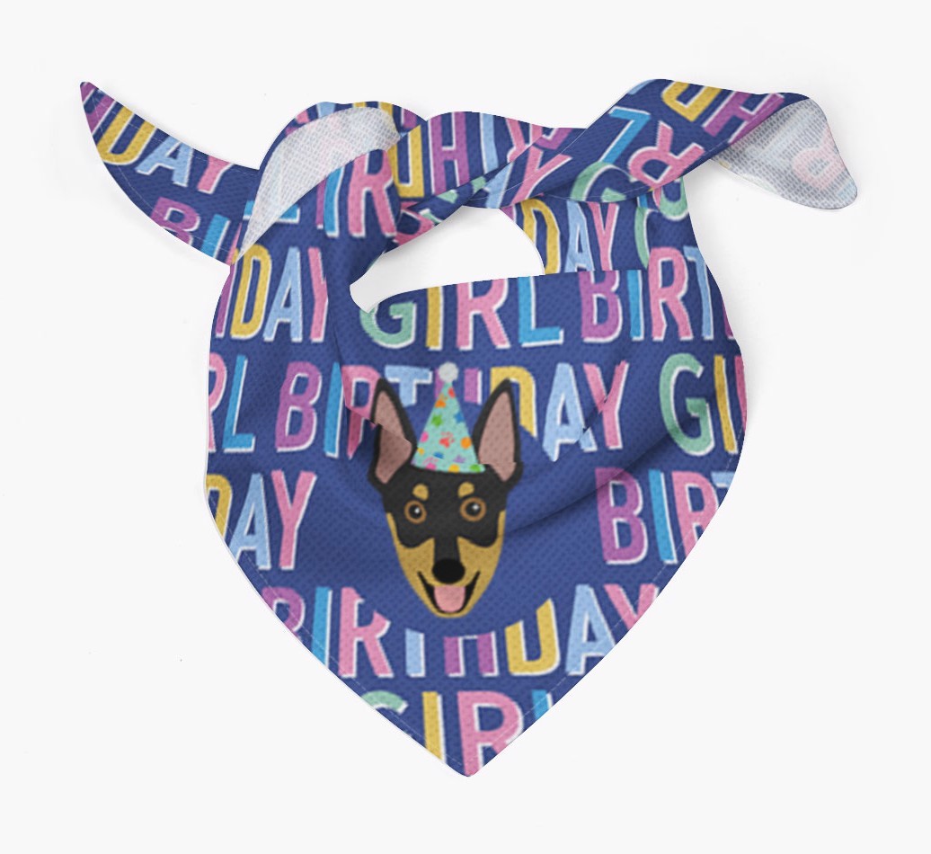Featuring a text pattern that reads 'birthay girl' and personalized with Australian Working Kelpie's cute icon (complete with a fun party hat), your Working Kelpie will look simply pawgeous on their special day when they're wearing this bandana.
