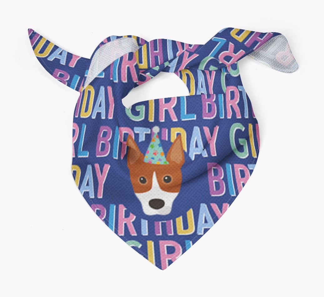 Featuring a text pattern that reads 'birthay girl' and personalized with Basenji's cute icon (complete with a fun party hat), your Basenji will look simply pawgeous on their special day when they're wearing this bandana.