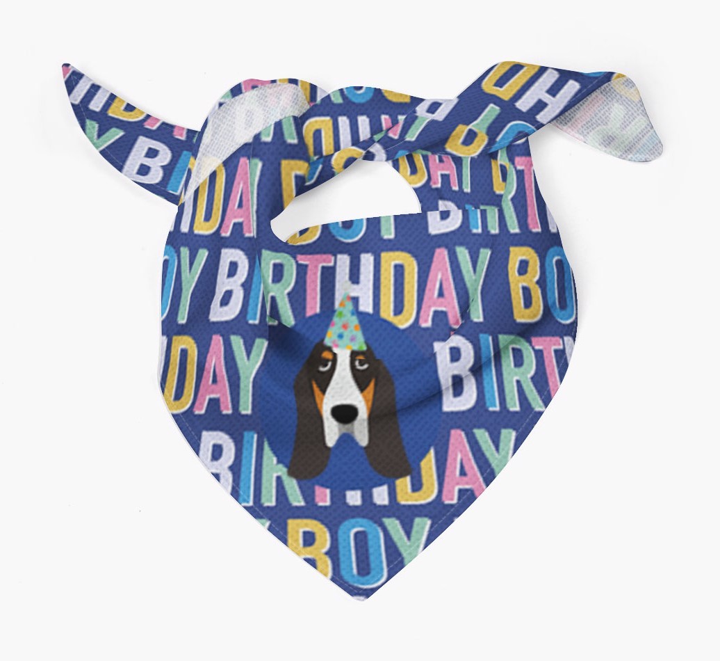 Featuring a colorful text pattern that reads 'birthay boy' and personalized with Basset Bleu De Gascogne's cute icon (complete with a fun party hat), your Basset Bleu will look simply pawgeous on their special day when they're wearing this bandana.