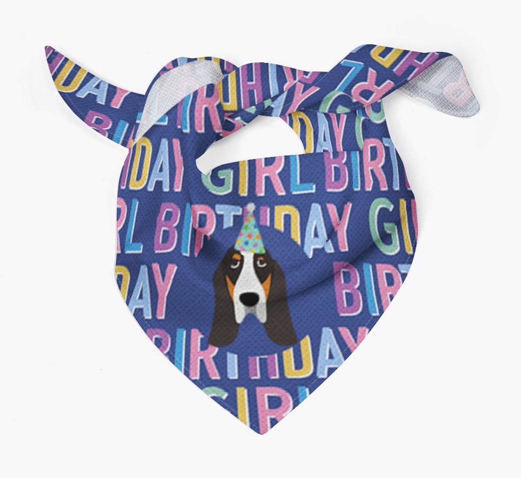 Featuring a text pattern that reads 'birthay girl' and personalized with Basset Bleu De Gascogne's cute icon (complete with a fun party hat), your Basset Bleu will look simply pawgeous on their special day when they're wearing this bandana.