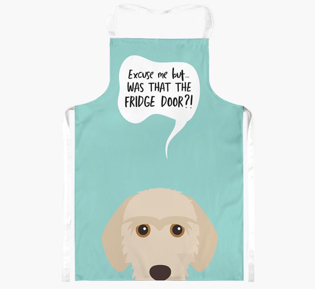 Featuring your hungry hound's cheeky icon and available in five eye-catching colors, this apron is a must-have for parents of greedy pups!