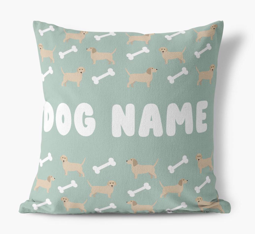 Personalized with Basset Fauve De Bretagne’s name against a background of Fauve icons and bones, this gorgeous pillow is full of pawsonality.