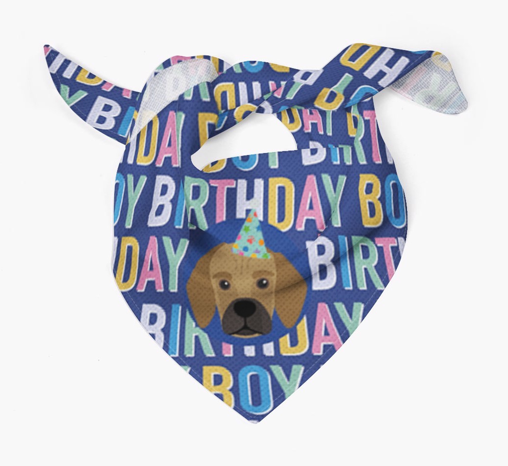 Featuring a colorful text pattern that reads 'birthay boy' and personalized with Bassugg's cute icon (complete with a fun party hat), your Bassugg will look simply pawgeous on their special day when they're wearing this bandana.