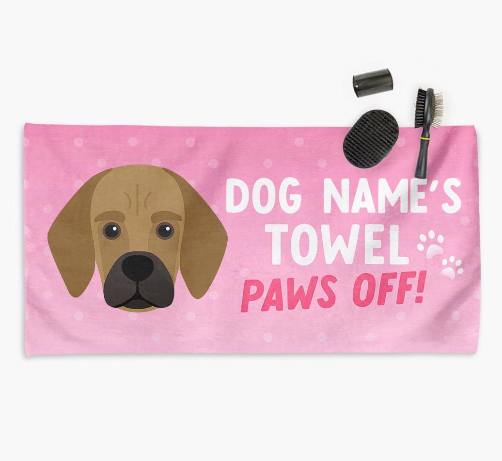 Perfect for messy pups and for pampering your Bassugg at bathtime, this soft and absorbent towel is made for cleaning your mucky pup and drying them off in a flash. It's personalized with Bassugg's name and icon and is printed with a message for everyone else to keep their paws off it!