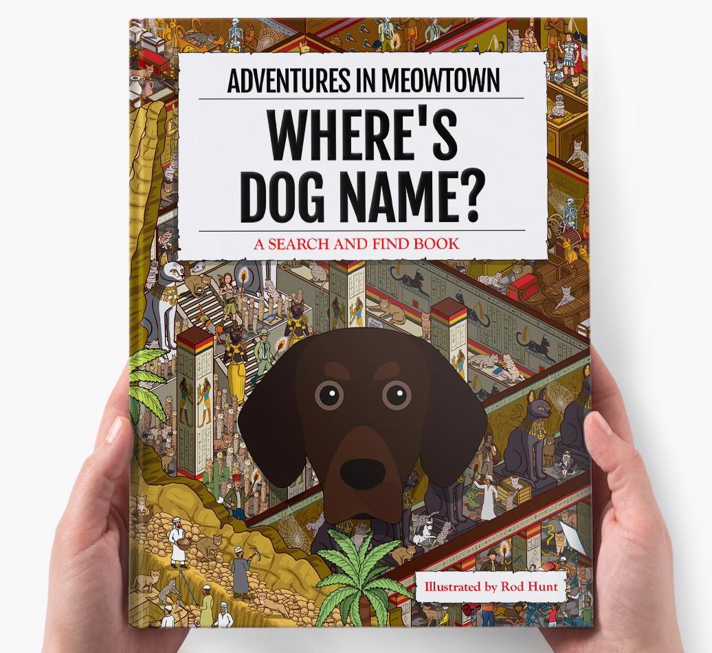 Get ready to unleash your inner detective with our popular Search & Find book, ‘Where’s (insert dog name)?’ It’s the personalized dog book everyone’s yapping about! With twelve beautifully illustrated locations to explore, we challenge you to find your adventurous {breedShortName} on each action-packed page. Can you spot all the canine cameos and funny parodies too?
