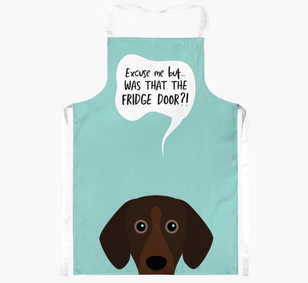Featuring your hungry hound's cheeky icon and available in five eye-catching colors, this apron is a must-have for parents of greedy pups!