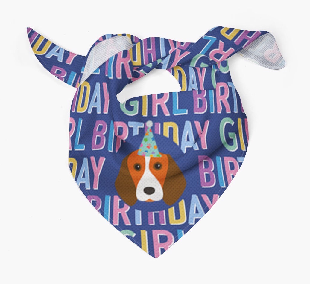 Featuring a text pattern that reads 'birthay girl' and personalized with Beagle's cute icon (complete with a fun party hat), your Beagle will look simply pawgeous on their special day when they're wearing this bandana.