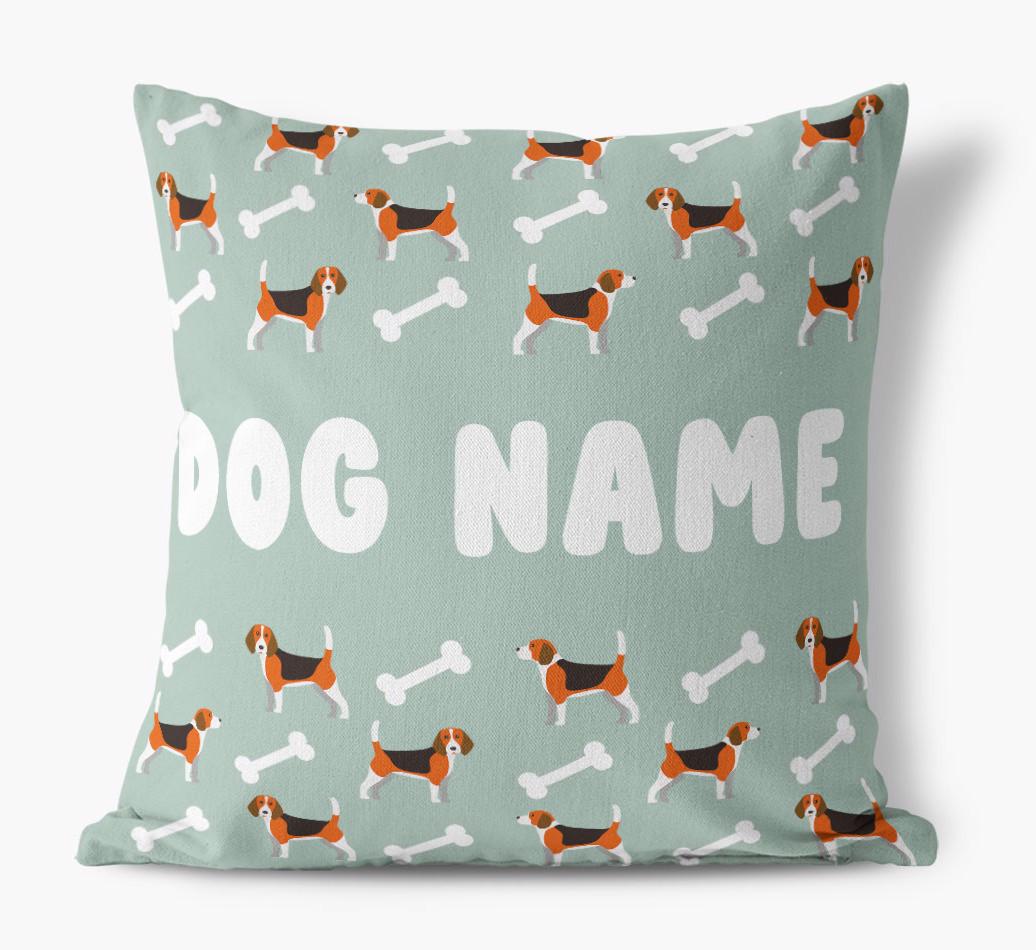 Personalized with Beagle’s name against a background of Beagle icons and bones, this gorgeous pillow is full of pawsonality.