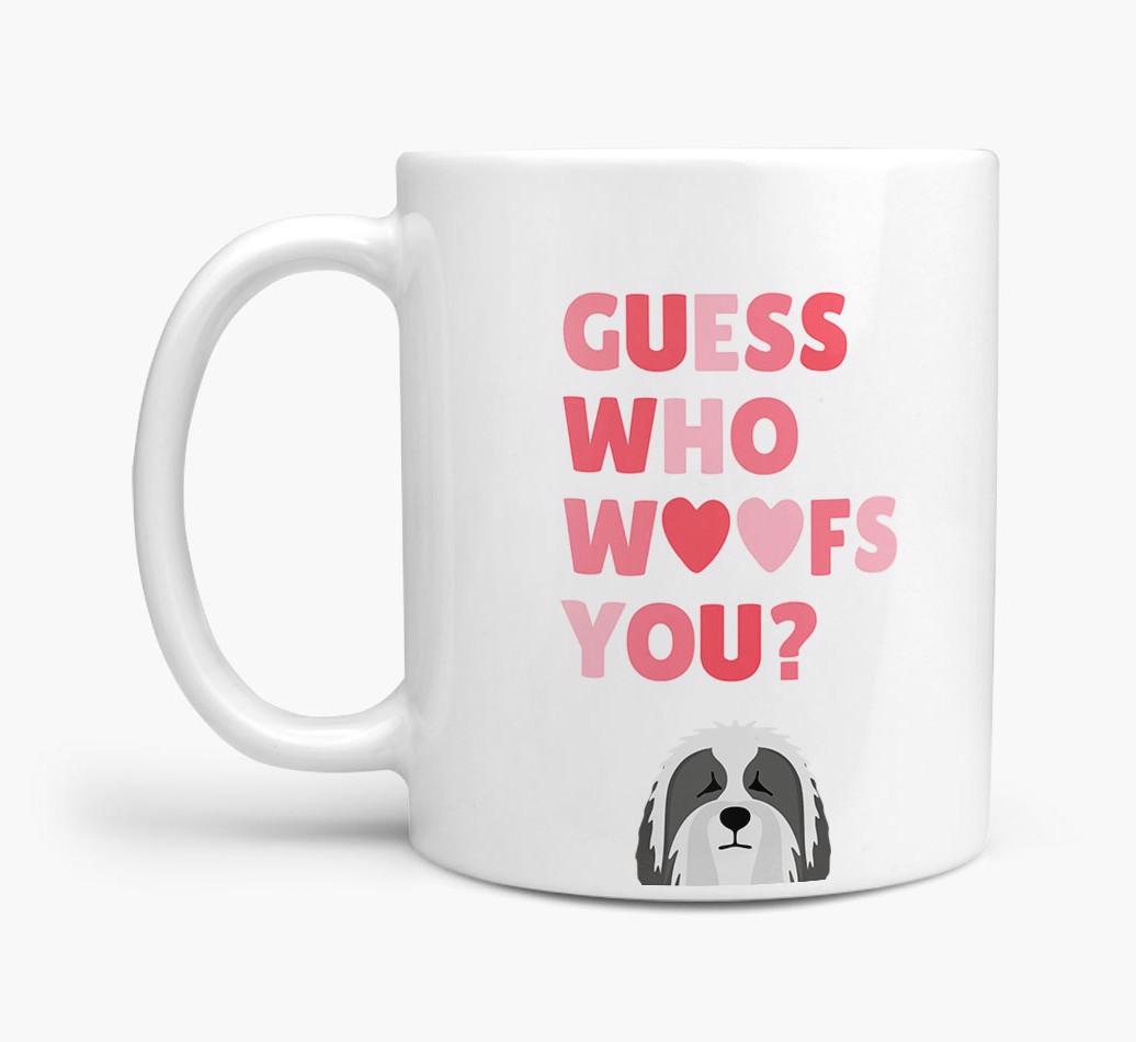 Personalized with Bearded Collie's cute face, this adorable mug is perfect for showing off the one who "woofs" you - how sweet!