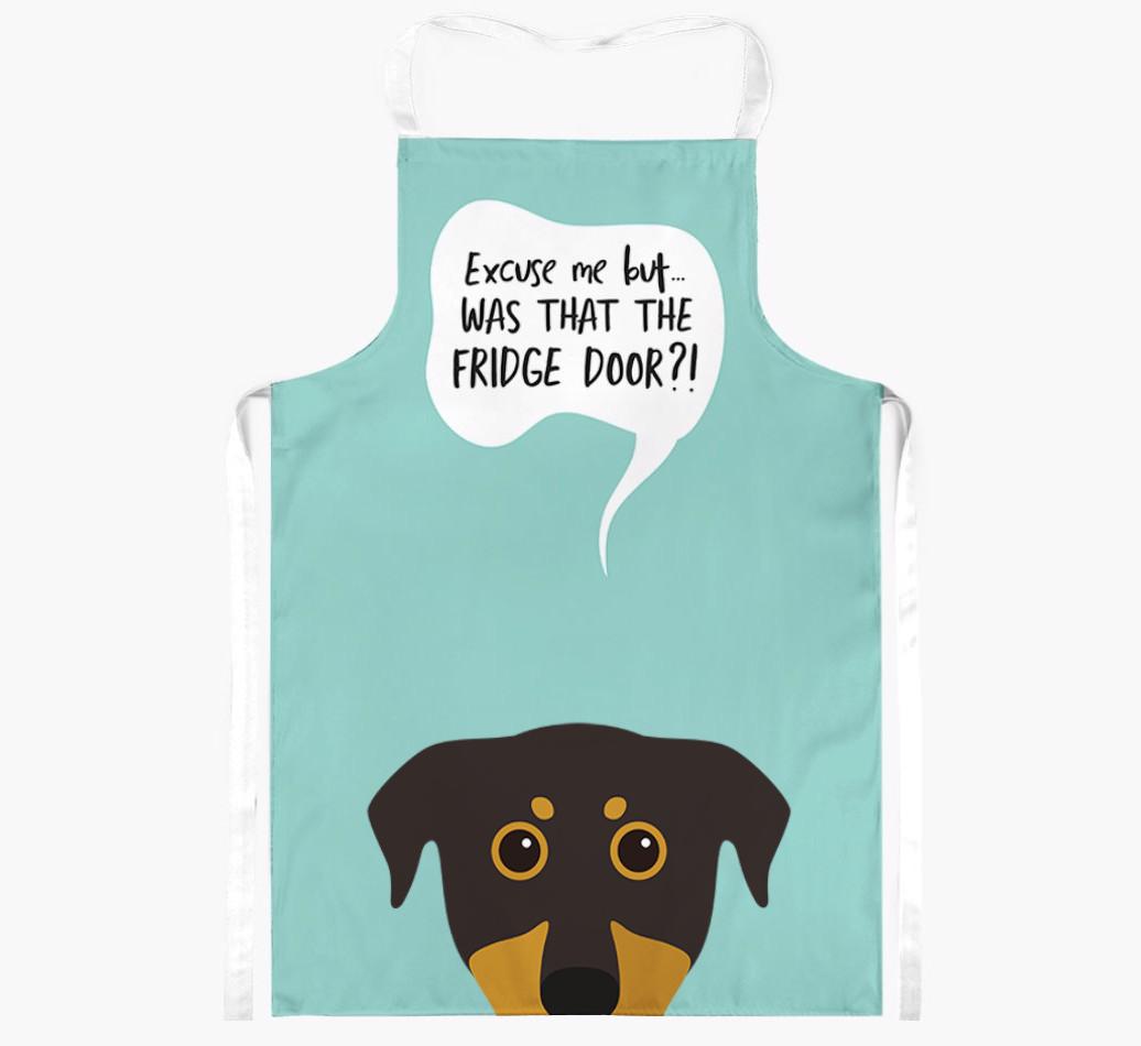 Featuring your hungry hound's cheeky icon and available in five eye-catching colors, this apron is a must-have for parents of greedy pups!