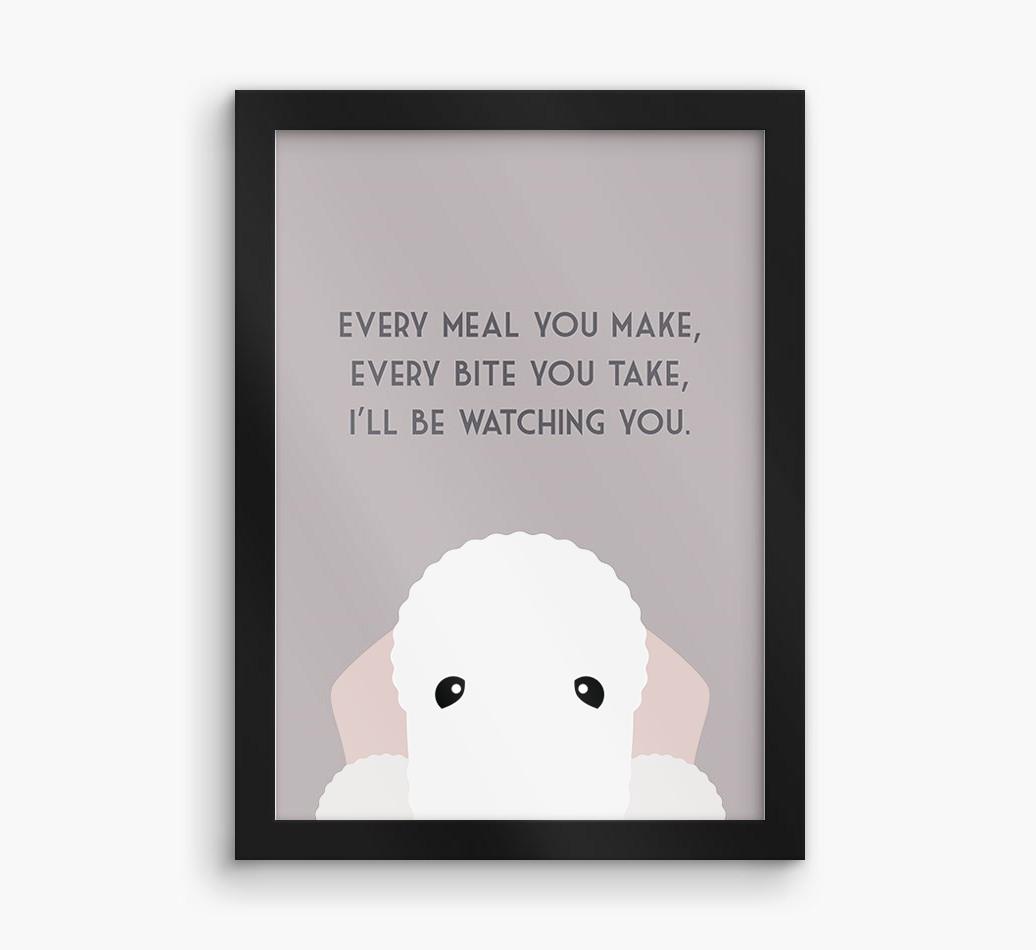 Printed with the words, ‘Every meal you make, every bite you take, I’ll be watching you’ and complete with our cute Bedlington peeking from the bottom of the design, this artwork will look great on display in the kitchen or anywhere Bedlington Terrier likes to watch you eat!