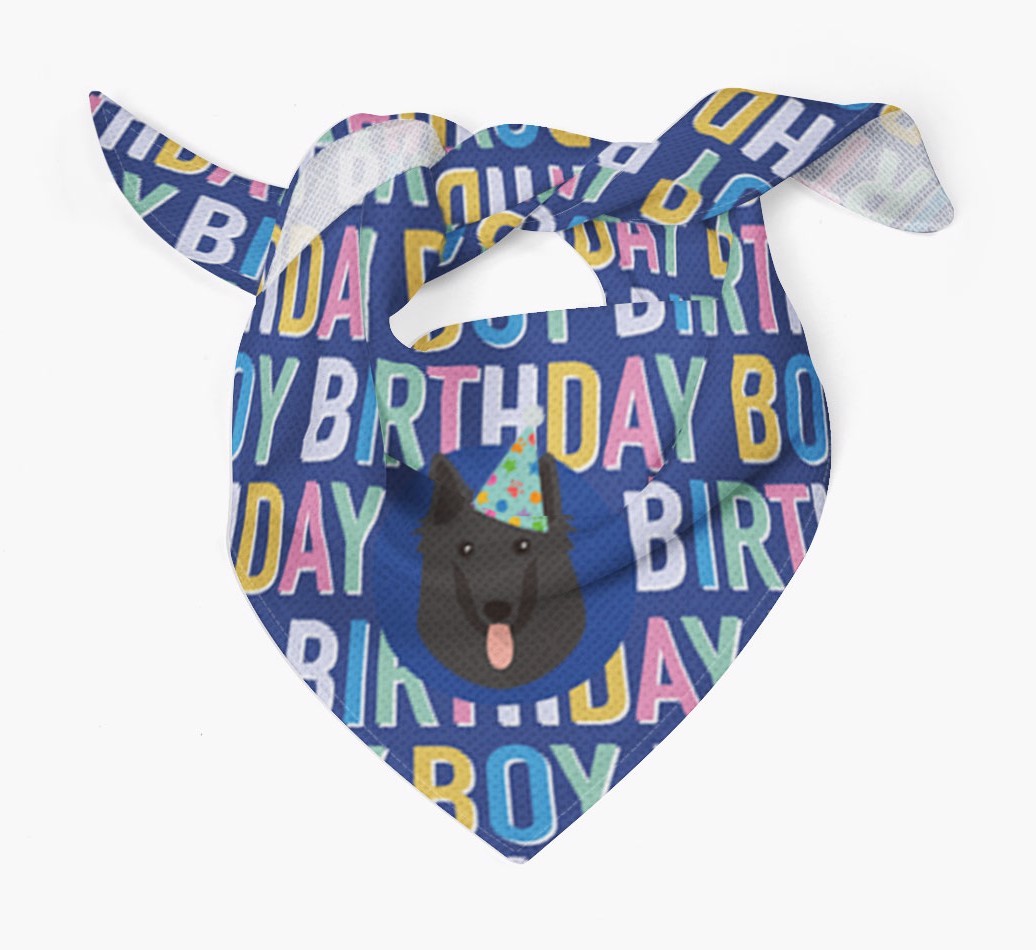 Featuring a colorful text pattern that reads 'birthay boy' and personalized with Belgian Groenendael's cute icon (complete with a fun party hat), your Belgian will look simply pawgeous on their special day when they're wearing this bandana.
