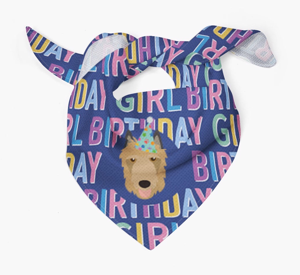 Featuring a text pattern that reads 'birthay girl' and personalized with Belgian Laekenois's cute icon (complete with a fun party hat), your Laekenois will look simply pawgeous on their special day when they're wearing this bandana.