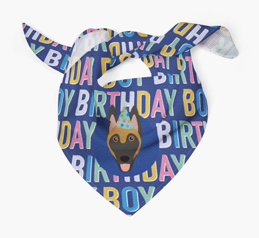Featuring a colorful text pattern that reads 'birthay boy' and personalized with Belgian Malinois's cute icon (complete with a fun party hat), your Malinois will look simply pawgeous on their special day when they're wearing this bandana.
