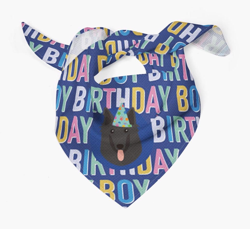 Featuring a colorful text pattern that reads 'birthay boy' and personalized with Belgian Shepherd's cute icon (complete with a fun party hat), your Shepherd dog will look simply pawgeous on their special day when they're wearing this bandana.