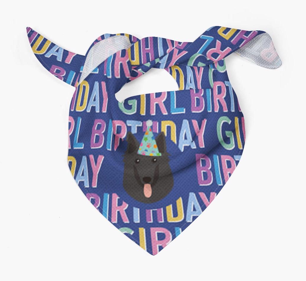 Featuring a text pattern that reads 'birthay girl' and personalized with Belgian Shepherd's cute icon (complete with a fun party hat), your Shepherd dog will look simply pawgeous on their special day when they're wearing this bandana.