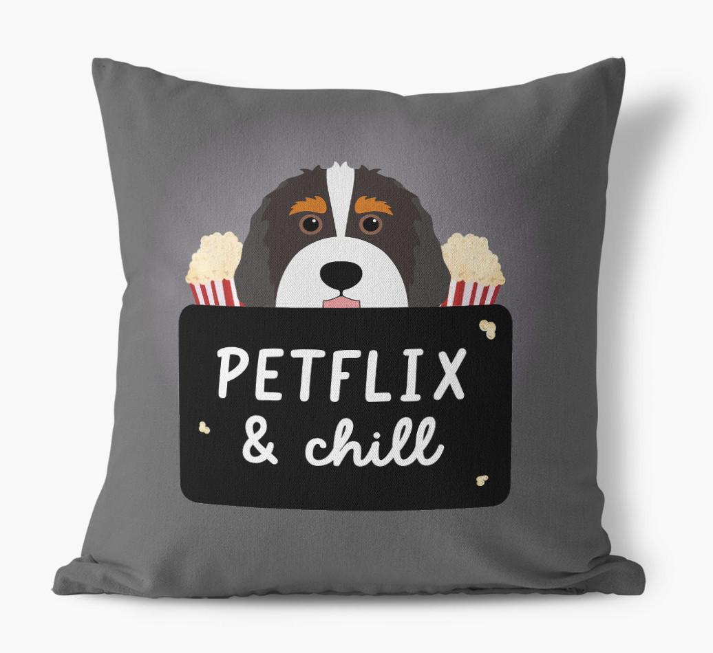 Personalized with your Bernedoodle's icon and available in six furbulous colours, this pillow will remind you that anytime is petflix and chill time!