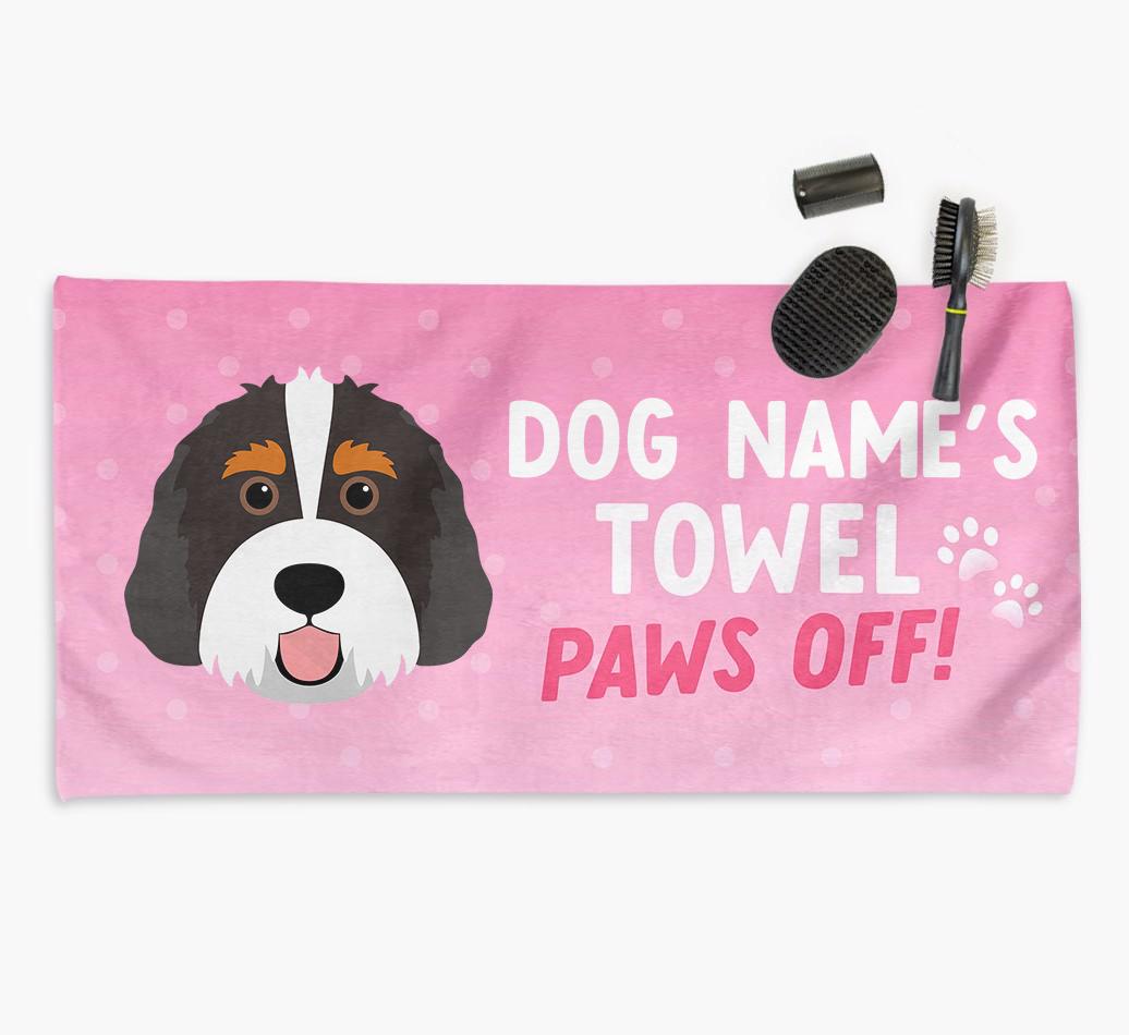 Perfect for messy pups and for pampering your Bernedoodle at bathtime, this soft and absorbent towel is made for cleaning your mucky pup and drying them off in a flash. It's personalized with Bernedoodle's name and icon and is printed with a message for everyone else to keep their paws off it!
