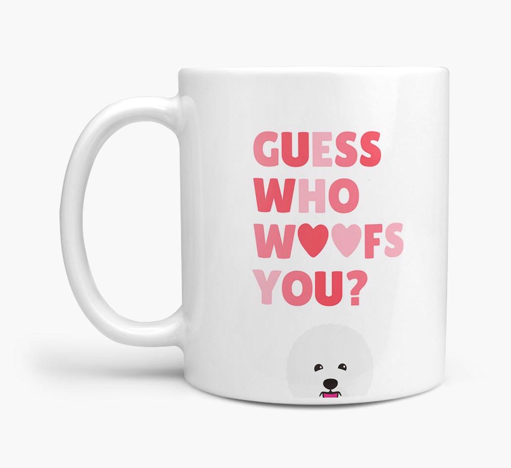 Personalized with Bichon Frise's cute face, this adorable mug is perfect for showing off the one who "woofs" you - how sweet!