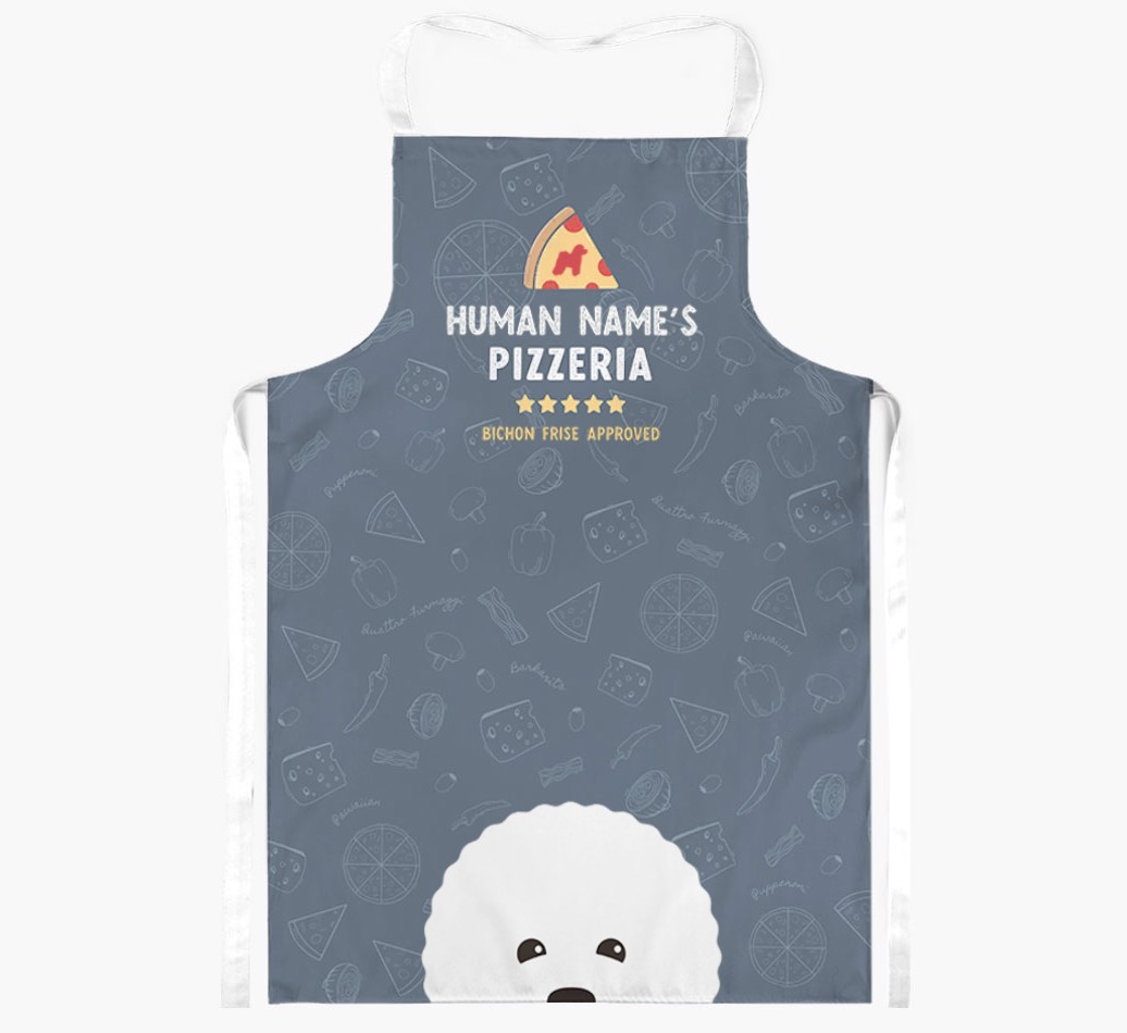 Featuring your furry friend's icon and lick of approval, plus your chosen human name, this apron is pawfect for anyone who considers themselves a pizza maestro in the kitchen. Available in a choice of 5 rustic colors, it'll make any Bichon Frise lover happy.
