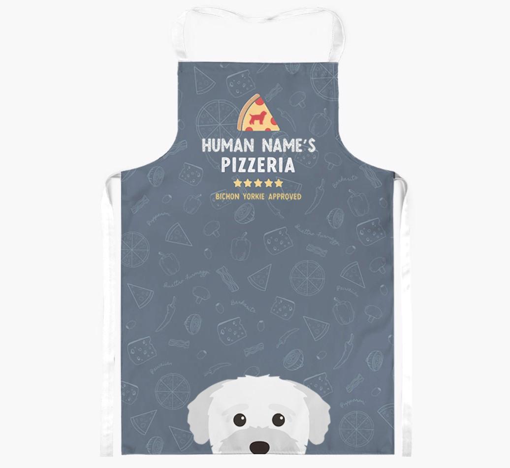Featuring your furry friend's icon and lick of approval, plus your chosen human name, this apron is pawfect for anyone who considers themselves a pizza maestro in the kitchen. Available in a choice of 5 rustic colors, it'll make any Bichon Yorkie lover happy.