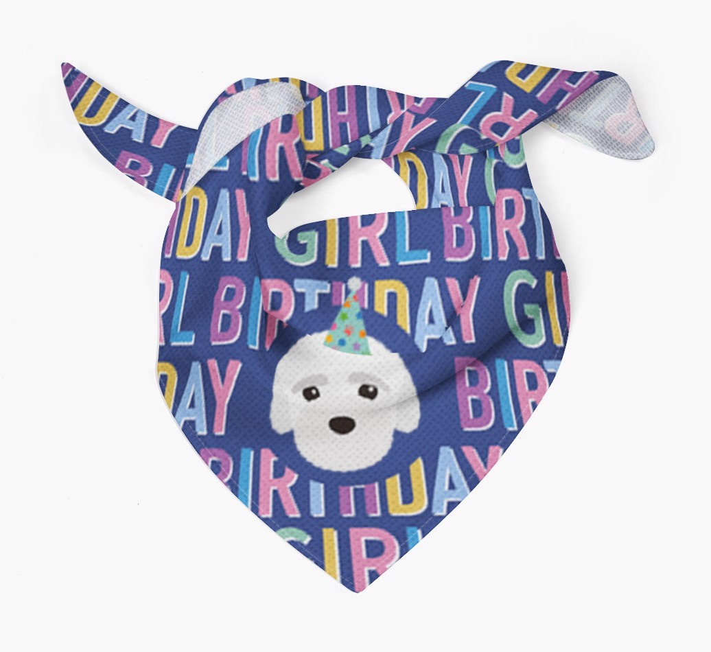 Featuring a text pattern that reads 'birthay girl' and personalized with Bich-poo's cute icon (complete with a fun party hat), your Bich-poo will look simply pawgeous on their special day when they're wearing this bandana.