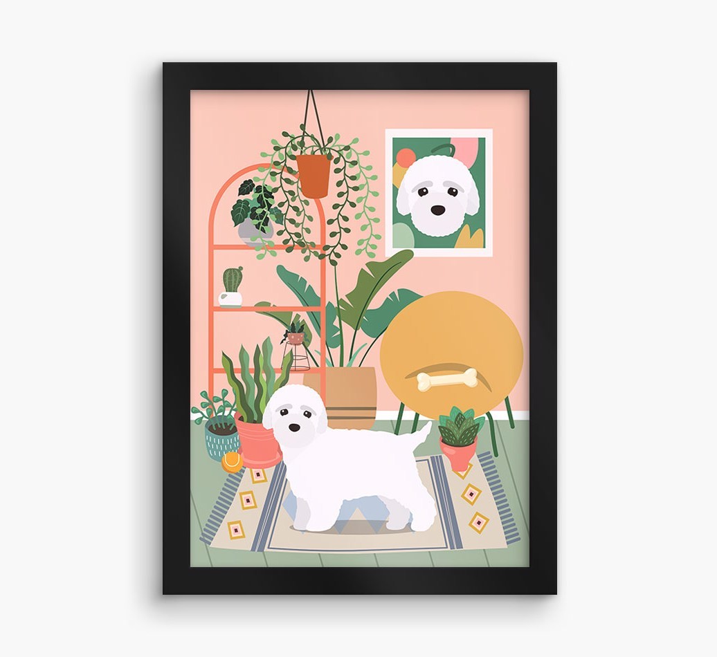 This contemporary piece of wall art pairs a chic living space with lovely pastel tones and a jungle of houseplants. Complete with the one that makes your house a home - Bich-poo! - this print is a wonderful way to display your love for your pooch.