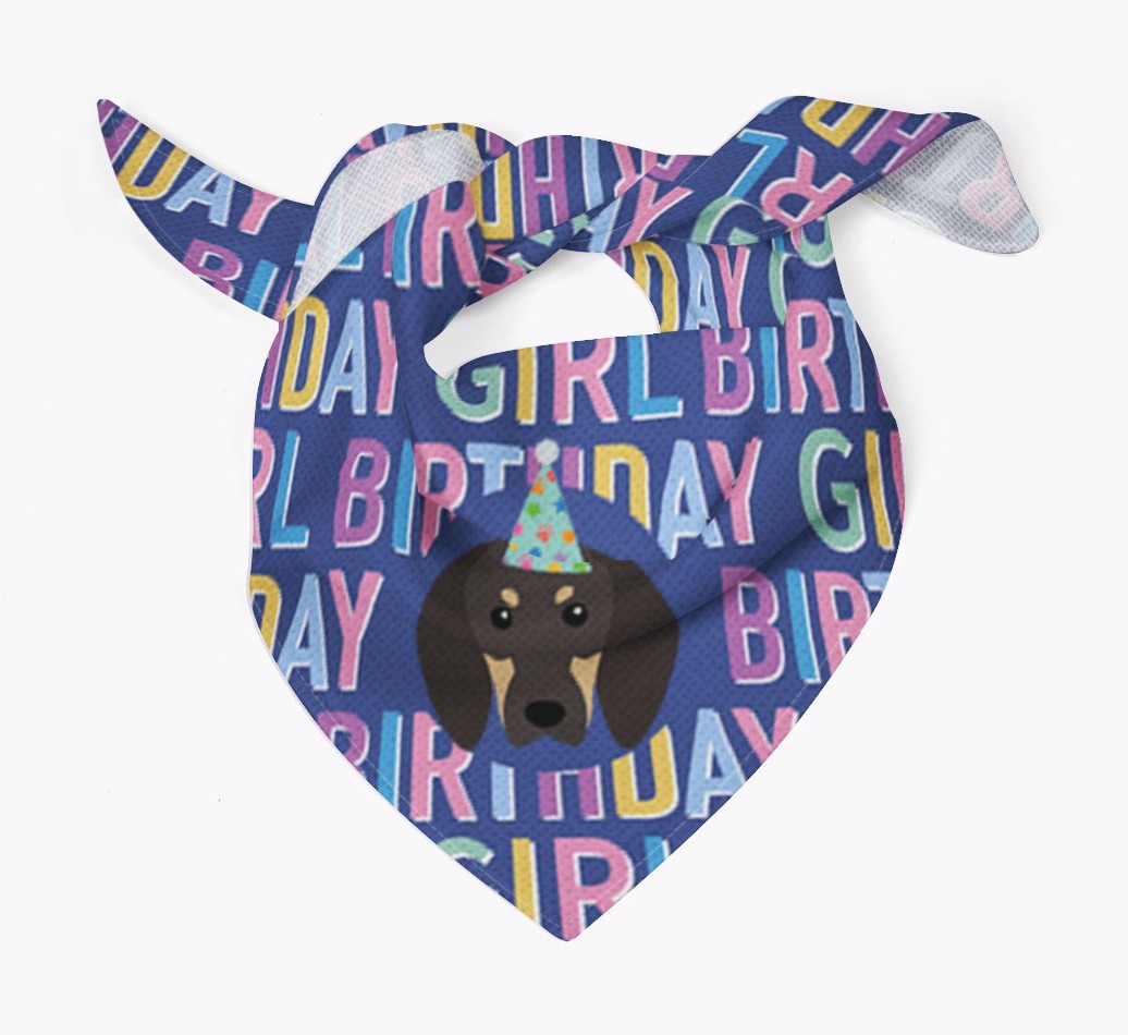 Featuring a text pattern that reads 'birthay girl' and personalized with Black and Tan Coonhound's cute icon (complete with a fun party hat), your Coonhound will look simply pawgeous on their special day when they're wearing this bandana.