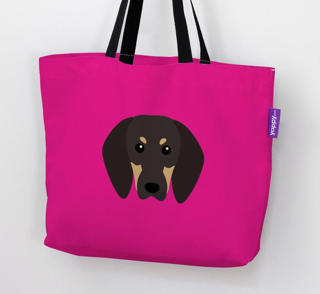 This Canvas Bag features an exclusive Black and Tan Coonhound icon printed on a bright, bold background.
