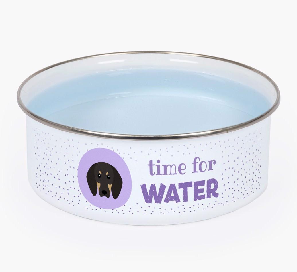 Time For Water: Personalized Enamel Black and Tan Coonhound Bowl