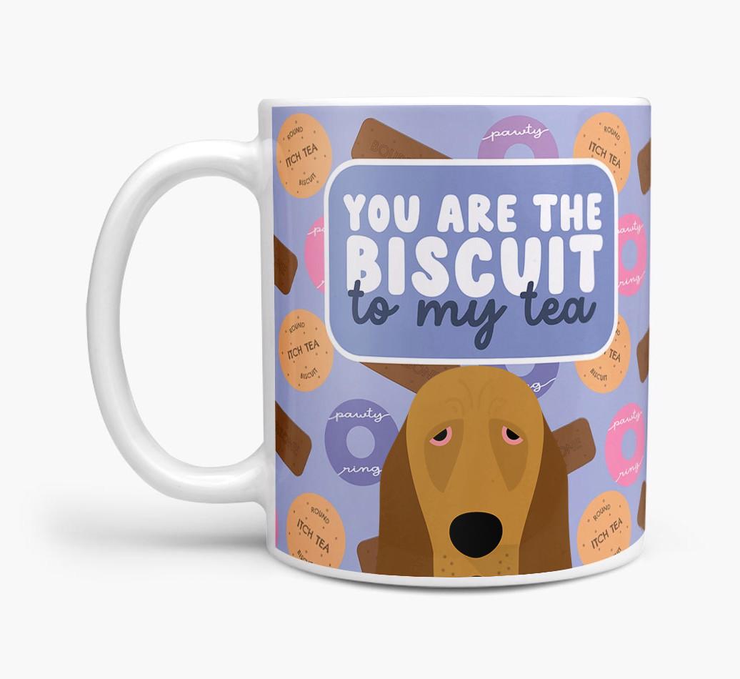 Featuring a cute biscuit motif paired with your Bloodhound's adorable face, this mug is bound to be a firm favorite in every household.