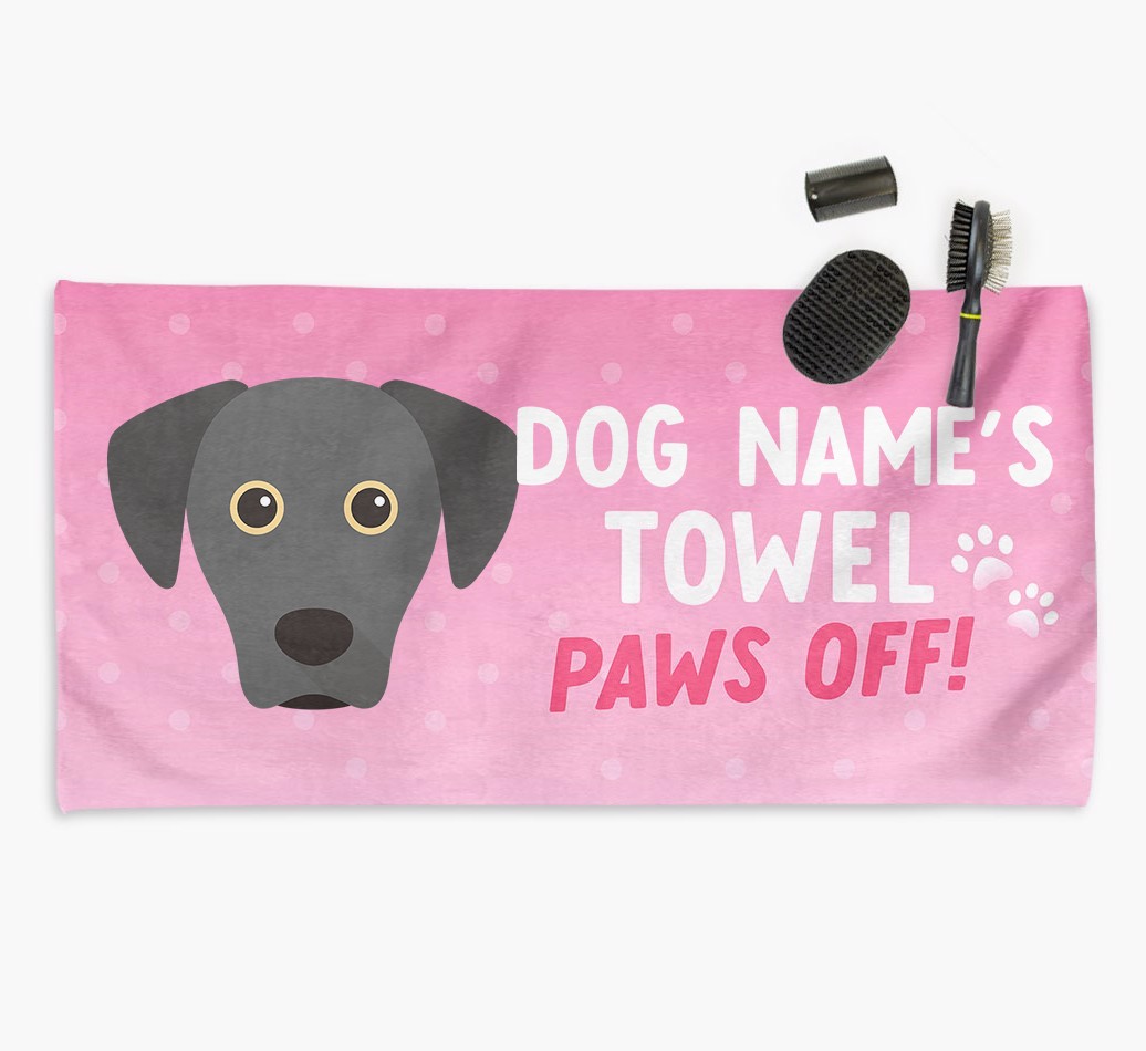 Perfect for messy pups and for pampering your Lacy Dog at bathtime, this soft and absorbent towel is made for cleaning your mucky pup and drying them off in a flash. It's personalized with Blue Lacy's name and icon and is printed with a message for everyone else to keep their paws off it!