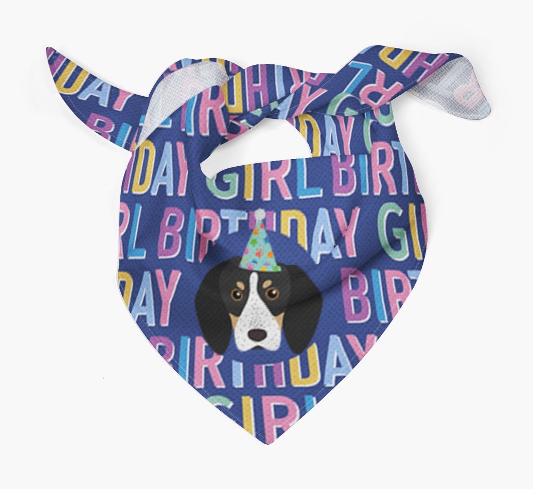 Featuring a text pattern that reads 'birthay girl' and personalized with Bluetick Coonhound's cute icon (complete with a fun party hat), your Coonhound will look simply pawgeous on their special day when they're wearing this bandana.